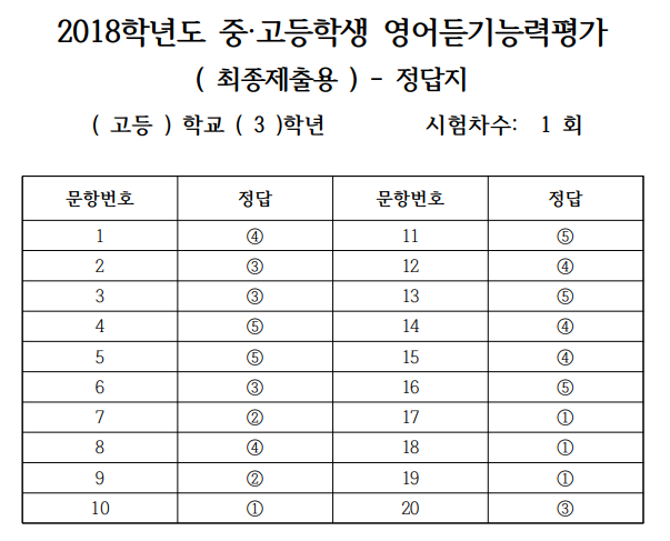 | 2018년 고3 전국영어듣기능력평가 2회차 (문제 및 정답) (0) | 2023.05.13 |